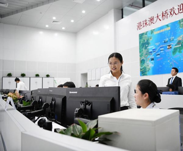 图:港珠澳大桥管理局调度中心工作人员在查看大桥车辆通行情况 新华社