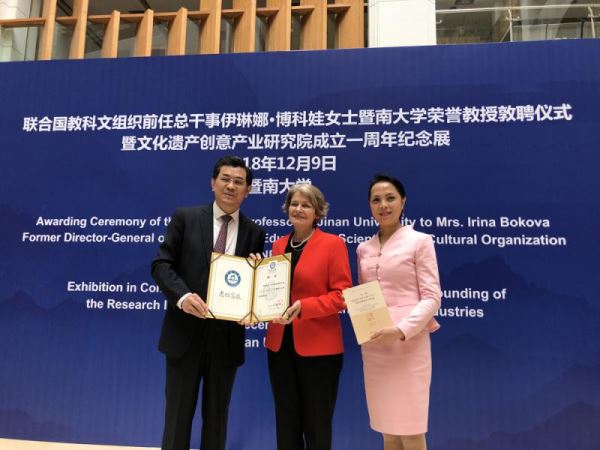 据了解,博科娃在2009至2017年担任联合国教科文组织总幹事,是历史上担任该职位的首位女性,也是第一位来自东欧国家的掌门人,曾被选为《福布斯》2016年度全球最具影响力女性第89位。应暨大文化遗产创意产业研究院院长陈平的邀请,博科娃9日访问暨大,并获颁名誉教授证书。暨大党委书记林如鹏表示,“博科娃女士的到来,将对学校加强与联合国教科文组织的合作,更好地走向世界提供有力的帮助。”他说,暨大将拓展中华文化海外传播基地,形成中华文化传承传播全球网络。