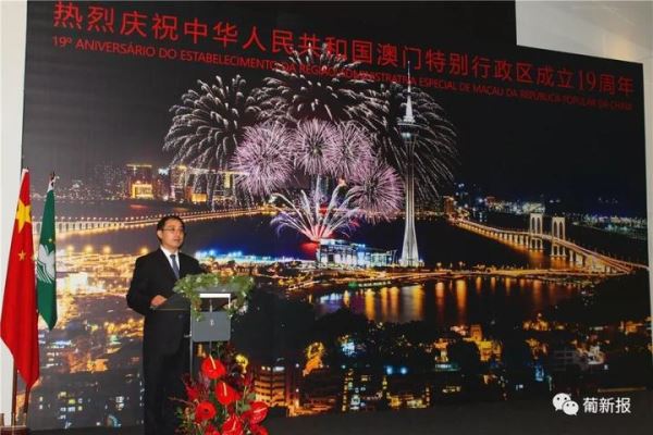 今天庆祝澳门特别行政区成立19周年,我谨对各位的光临表示诚挚的感谢和热烈的欢迎。我非常高兴,在国家主席取得丰硕成果的国事访问葡萄牙两周后举办这个招待会。也欢欣地读到中华人民共和国和葡萄牙共和国关于进一步加强全面战略伙伴关系的联合声明中提及:双方肯定中华人民共和国澳门特别行政区成立以来取得的显著发展成就;强调澳门在中葡关系发展的重要作用,以及双方愿意进一步发挥澳门桥梁和纽带作用,促进中葡长期友好关系,并继续支持澳门发挥中国与葡语国家商贸合作服务平台。