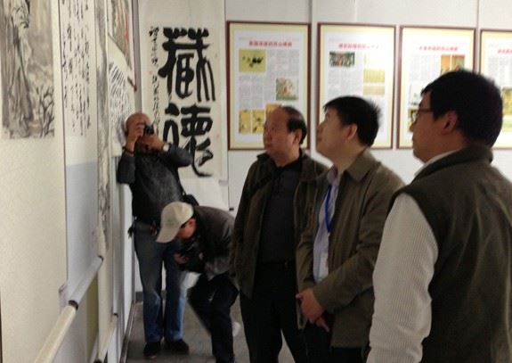 径山镇党委委员陈兴群(右2)、镇政府调研员张宏明(右1)和闲林镇方家山社区党委副书记李文科(右3)在参观画展。