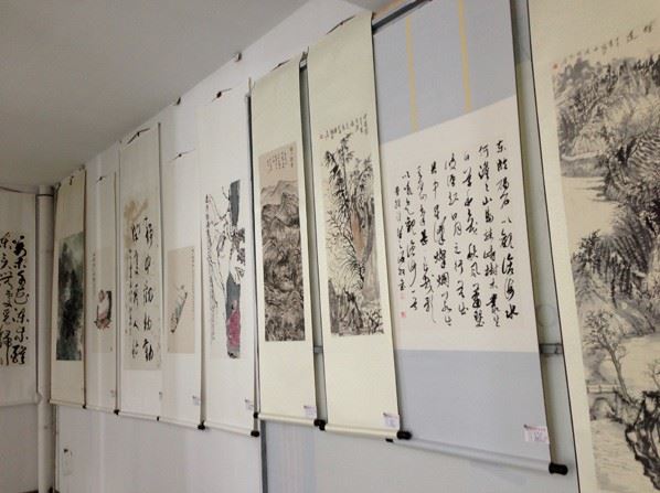 径山禅意书画展展厅一角,画展展示了来自美国、加拿大等国家和地区的44件书画作品。