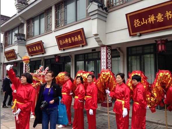 《径山禅意书画展》门前,老大娘列队准备舞龙助兴。