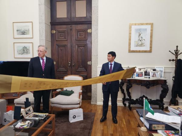 随后,张玺校长向Almeida Henriques市长介绍邯郸市教育概况及邯郸地理、历史、经济等,并赠送邯郸文化代表作“黄粱美梦”画卷;同时诚挚请A市长帮助邀请维塞乌的葡萄牙企业到邯郸参观考察,以邯郸科实和维塞乌理工学院合作为契机,加强两市文化教育交流,经济贸易往来,Almeida Henriques市长表示赞许,并以维塞乌城市画册做为礼物赠送给邯郸市市长,委托张玺校长转交他给邯郸市长的亲笔信函,希望未来能与邯郸建立友好合作的城市。张校长表示,非常荣幸当担此任,为促进跨国两市友好做出积极贡献。