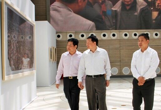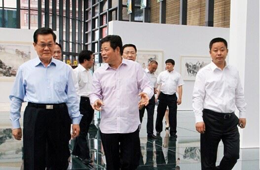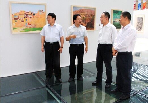 陕西省省长娄勤俭(左二)参观“彩绘丝路”作品展(王冠冠 摄)