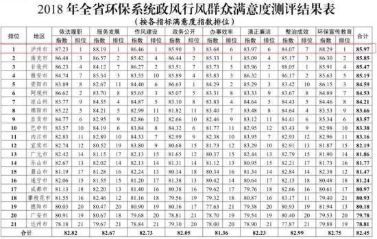 中新网四川新闻1月14日电 (邹立杨)记者14日从泸州市环保局获悉,为深入推进四川省生态环境部门政风行风建设,有效提升机关行政效能和窗口单位服务质量,四川省生态环境厅委托第三方机构于2018年9月至10月,对四川21个市(州)环保部门开展了政风行风群众满意度测评。其中,泸州市综合指标位列全省第一。
