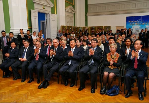 中共中央政治局常委、中央书记处书记刘云山,中共中央组织部常务副部长陈希,文化部副部长丁伟,丹麦第一副议长哈德,丹麦文化大臣耶维德,雕塑艺术家吴为山等出席哥本哈根中国文化中心揭牌仪式 中新社发 王保胜摄
