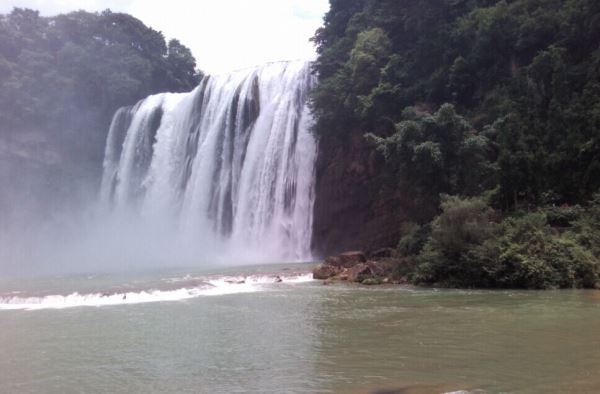 7月10日,我们一行来到了著名的黄果树大瀑布。黄果树瀑布是贵州第一胜景,中国第一大瀑布,也是世界最阔大壮观的瀑布之一。风景区内瀑布成群,洞穴成串,峰峦叠翠,植被奇特,伏流、溶洞、石林、石壁、峡谷比比皆是,呈现出层次丰富的喀斯特山水旖旎风光。黄果树瀑布落差74米,宽81米,河水从断崖顶端凌空飞流而下,瀑布对岸高崖上的观瀑亭上有对联曰:“白水如棉不用弓弹花自散,虹霞似锦何须梭织天生成”,此乃是黄果树瀑布的真实写照。但黄果树瀑布的形态因季节而有变化,冬天水小时,它妩媚秀丽,轻轻下泻;到了夏秋,水量大增,那撼天动地的磅礴气势,简直令人惊心动魄。瀑布激起的雪沫烟雾,高达数百米,漫天浮游,竟使其周围经常处于纷飞的细雨之中。瀑布后的水帘洞相当绝妙, 134米长的洞内有6个洞窗,5个洞厅,3个洞泉和1个洞内瀑布。游人穿行于洞中,可在洞窗内观看洞外飞流直下的瀑布;每当日薄西山,凭窗眺望,犀牛潭里彩虹缭绕,云蒸霞蔚,苍山顶上绯红一片,迷离变幻,这便是著名的“水帘洞内观日落”。 瀑布下的犀牛滩,瀑布溅珠上经常挂着七彩缤纷的彩虹,随人移动,变幻莫测。古人说“天空云虹以苍天作衬,犀牛滩云虹以雪白之瀑布衬之”,故有“雪映川霞”的美称。