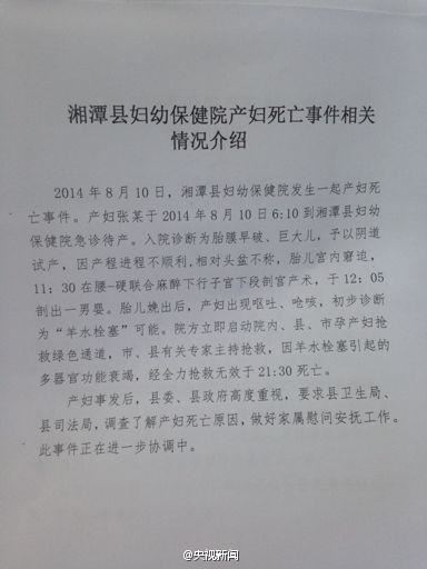 针对此事,湘潭县卫生局称,8月10日12点05分胎儿出生后,产妇出现呕吐呛咳,院方立即抢救,但产妇因羊水栓塞引发多器官功能衰竭,抢救无效于21点30分死亡。目前湘潭县卫生局、司法局已介入调查。