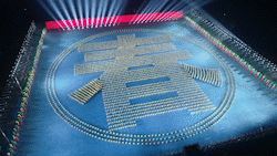 数千名演员巧妙地组成的“春”和“福”字,营造出新春佳节的喜庆氛围,6000多平方米的五星红旗精彩亮相,祝福祖国日益昌盛、繁荣富强。