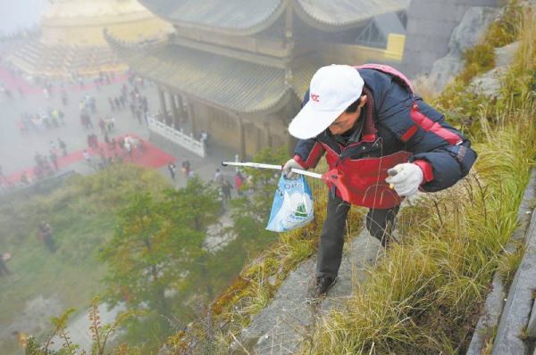 4日,彭文才在金顶护栏外的悬崖上捡垃圾
