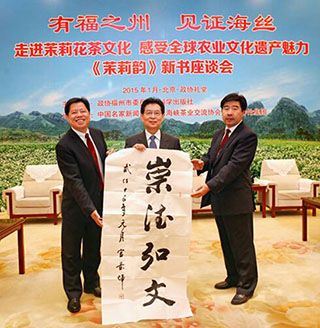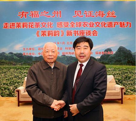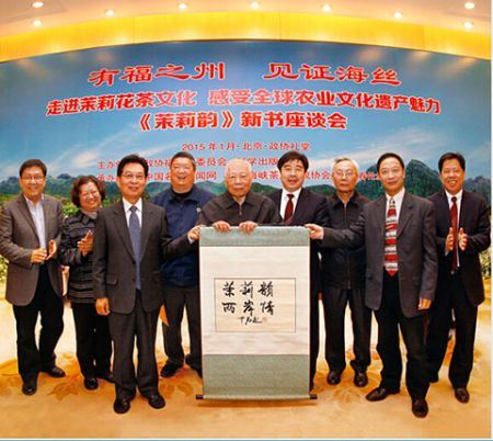 (中国网中国视窗讯 王居顺)2015年1月5日,由政协福州市委员会、科学出版社联合主办,中国名家新闻网、福州海峡茶业交流协会、福建春伦集团承办的“有福之州见证海丝”——走进茉莉花茶文化 感受全球重要农业文化遗产魅力——《茉莉韵》新书座谈会在北京全国政协礼堂隆重举行。《茉莉韵》由福州市政协组织编写,中国著名学者、书法大家欧阳中石题写书名,科学出版社出版。第九届、十届全国政协副主席张克辉,中国政研会副会长官景辉,国际旅游休闲产业协会副主席、中国合作经济学会旅游合作专业委员会主任张北英,中国茶叶流通协会常务副会长王庆,全国政协文史馆副馆长许水涛,全国政协教科文卫体委员会办公室副主任张维,联合国粮农组织驻华代表官员戴卫东,科学出版社领导彭斌,福州海峡茶业交流协会会长吴依殿,福州市政协秘书长吴建成,国家茶叶加工技术研发茉莉花茶研发专业分中心主任、春伦集团董事会主席傅天龙,国家茶叶加工技术研发茉莉花茶研发专业分中心副主任傅天甫,以及国家有关部委办、有关行业协会领导等各界嘉宾数百人出席座谈会。座谈会由福州海峡茶业交流协会会长吴依殿主持。