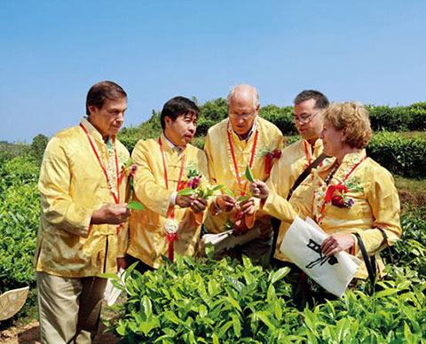 国际茶叶委员会主席迈克尔·本斯顿、美国茶叶协会主席约瑟夫·斯幕瑞尼、加拿大茶叶协会主席路易斯·罗伯格、俄罗斯茶叶咖啡协会主席拉马兹·恰托瑞亚在国家茶叶加工技术研发茉莉花茶研发专业分中心主任傅天龙陪同下,在春伦鼓岭生态茶叶基地考察(中新社发 王保胜 摄)