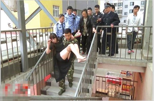在事发现场,4名消防战士铺设救生气垫,另外4名消防战士上到楼顶平台,准备进行营救。现场两名大妈见状不断夸赞着女孩漂亮,分散女孩注意力,消防队员飞扑上前抱住女孩,将其救下。