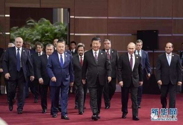 (习近平和出席开幕式的外方领导人共同步入第二届“一带一路”国际合作高峰论坛会场。图片来源:新华社)