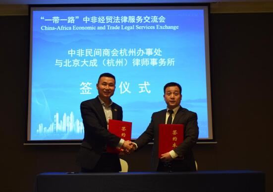 在与会嘉宾的见证下,举行了中非民间商会杭州办事处与北京大成(杭州)律师事务所的签约仪式,今后大成律师事务所将为办事处及会员企业提供有关非洲经贸方面的法律服务。