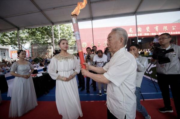 由国家级非物质文化遗产“乔氏琉璃”烧制技艺代表性传承人崔书林传递琉璃圣火。 韦亮 摄
