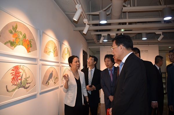 6月9日,出席“魅力中国—广东文化周”的嘉宾在活动现场观看“花语•物语—中韩女画家作品联展”。(图片由首尔中国文化中心提供)