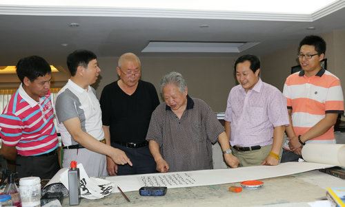 活动期间,在白俄罗斯文化联盟中国首席代表、中华志愿者艺术家委员会外联部主任刘瀚锴的带领下,我国著名书法家、鹏体草书创始人王云鹏;中国国宝书画研究院深圳分院院长胡艺;北京勤永文化传播有限公司总经理高艳等一行专程拜访了中华志愿者艺术家委员会总顾问、著名国画大师姚治华先生。在交流中,姚治华先生对鹏体草书书法艺术所体现的“美、神、容、简、放”及其艺术的严谨、艺术的灵魂、艺术的生命和价值作出高度评价。并亲笔为鹏体草书创始人王云鹏书写的毛泽东诗词长卷题词。