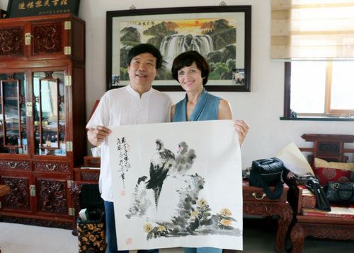 中国国宝书画研究院院长谢飞向白俄罗索洛卡斯委特拉娜女士赠送国画作品