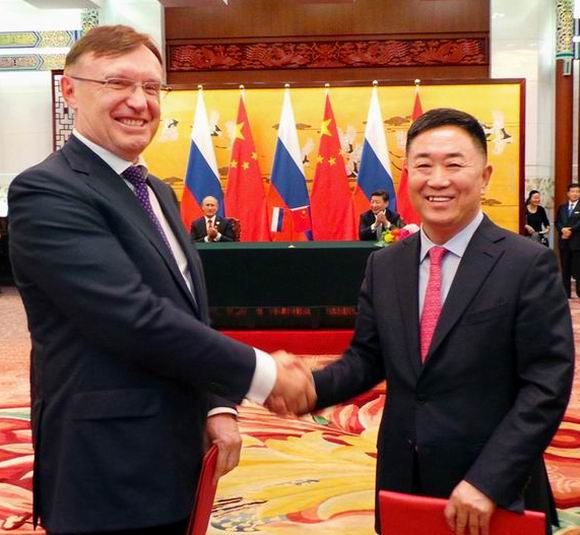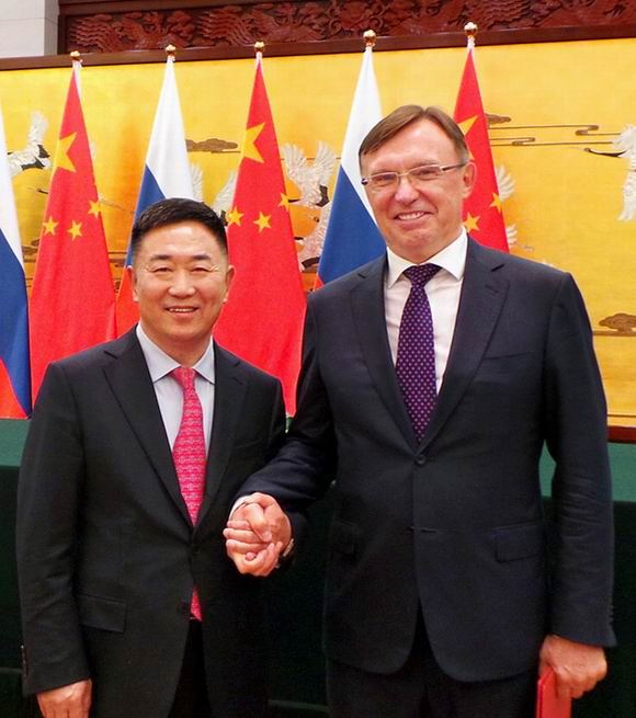 华泰汽车集团董事长张秀根与俄罗斯卡玛斯KAMAZ汽车有限公司董事长谢尔盖 A. 卡国金签署双边合资项目协议 中新社发 王保胜 摄
