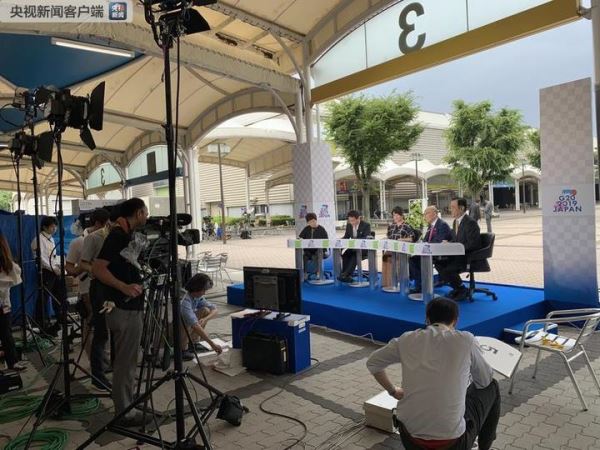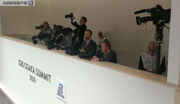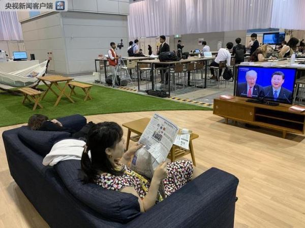 △6月29日上午,大阪国际会展中心入口处的现场演播室。日本一档政治谈话节目《Wake Up! Plus》正在直播,嘉宾们讨论的高频词是“中美”。(央视记者沈忱拍摄)
