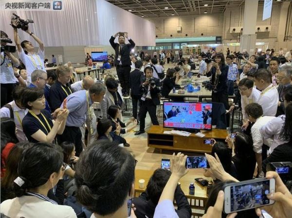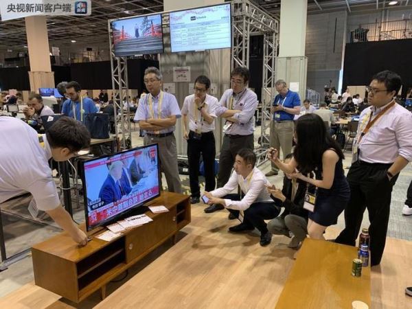 △NHK对中美元首会晤做了短暂的直播,G20新闻中心的一块电视屏幕吸引了各国记者。通过一组图片来感受一下这个“吸睛”的过程。(央视记者沈忱、荆伟,央广记者李思默拍摄)