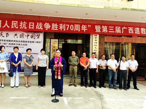 中国周易新闻网讯:为纪念中国抗日战争胜利暨世界反法西斯战争胜利70周年,庆祝贵港市道教协会、桂平市道教协会成立3周年; 由中共桂平市委宣传部、桂平市文化体育和广播电视局、桂平市文联、桂平市民族宗教局联合主办;贵港市道教协会、桂平市道教协会、桂平市书协、桂平市美协联合承办;桂平市生活网、桂平市金点子传媒、桂平市善品家宴、桂平市长泰宾馆、桂平市三联广告公司、桂平市辉泰印刷厂、桂平市林珊茶园协办的“第三届广西道教书画展”于9月16日在桂平市禅佑艺术馆隆重举行。