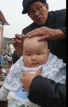 在义渡广场外的免费剃头点记者看到,老剃头匠们剃头根本不用现代的电推,而是用传统的手工推子剃头,一根白帕子搭在肩头,带一幅老花眼镜,明晃晃的剃刀在手中挥舞自如,几分钟,小孩儿头就被刮得铮亮。有些娃娃天生害怕剃头,在父母的陪同下,眼泪哗哗,一边的父母却笑得合不拢嘴。