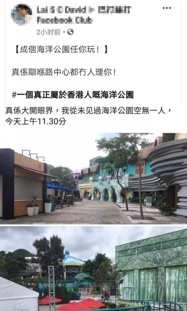 人流锐减的还有香港两大主题乐园:迪士尼及海洋公园。网上短片显示,昔日座无虚席的海洋公园海洋剧场却只有零星几个人,这时已过中午十二点,表演还有5分钟便开始。