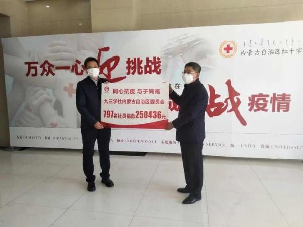 3月2日,九三学社内蒙古区委专职副主委刘德代表全区各级组织和广大社员,向内蒙古红十字基金会捐赠了250436元爱心善款,定向用于全区疫情防控工作。内蒙古自治区红十字会党组成员、副会长孟克宝音接受捐赠,并代表自治区红十字会向九三学社内蒙古自治区委员会颁发了捐赠证书。