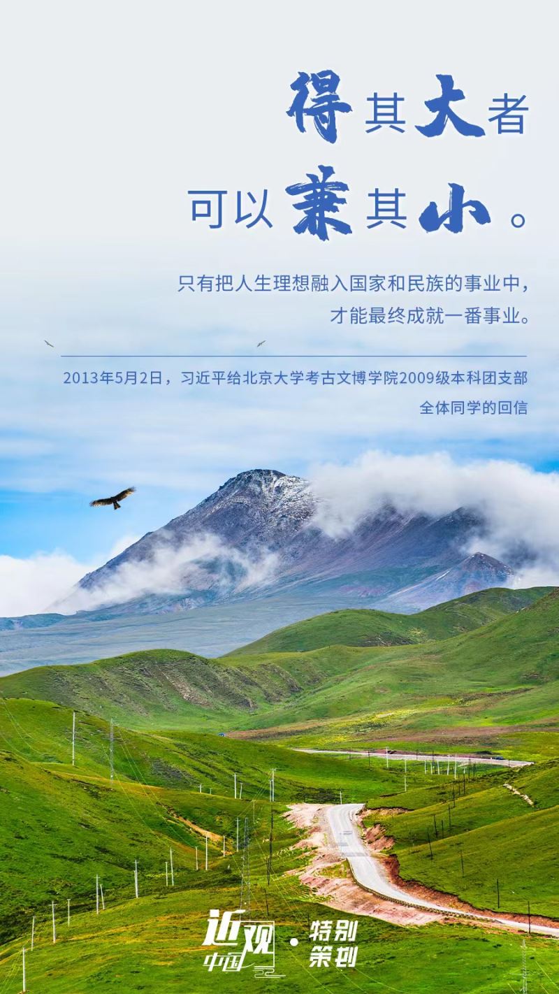2013年5月,习近平在给北京大学的同学们回信时也引用过“得其大者可以兼其小”,以此告诉中国的年轻人,“只有把人生理想融入国家和民族的事业中,才能最终成就一番事业”。
