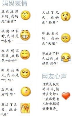 网友“飞向天空344”表示,他虽然是男生,但是看完这篇“表情文”后仍旧红了眼眶。“平时很少对妈妈表达爱意,看完又感动又愧疚。”网友“飞向天空344”告诉记者,平时在外地工作,也很少和妈妈联络,只有当自己有需要的时候,才会给家里电话,今年开始,他要多给家里打打电话了。