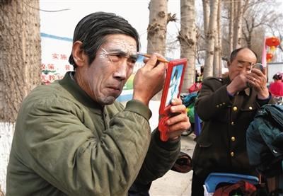 年近六十的大爷正在描眉,他要扮演一位老太太。
