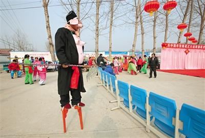 接下来的节目,是高跷表演。四位打扮成猪八戒、孙悟空等的演员表情生动,服饰夸张,一出现就吸引了观众的注意,几位小朋友更是被逗得前仰后合,他们时而昂着头,盯着演员们一动不动,时而不住地拍手。“妈妈,他的耳朵怎么那么大,鼻子怎么那么长。”一位小朋友指着打扮成猪八戒的演员向妈妈问道。