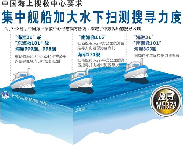 何建中介绍,4月7日8时,中国海上搜救中心经与澳方协调,指定了中方舰船的搜寻区域。交通运输部所属“海巡01”轮、“东海救101”轮和中国海军999舰、998舰在疑似海区面积为144平方公里的搜寻区域内进行复核扫测;“南海救115”和海军171舰分别在西区近6万平方公里和南区3万多平方公里的海区搜寻并向疑似海区靠拢;“海巡31”、“南海救101”及海军863舰继续在印度洋东部海域搜寻。