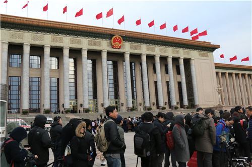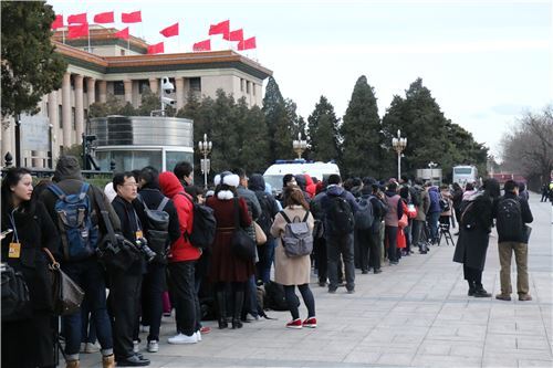 上图:人民大会堂东门排队的媒体工作者