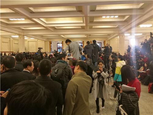 上午7时40分,进入到人民大会堂的媒体工作者们,已经蜂拥至“部长通道”,迅速选定位置。为了保证拍摄质量,一些记者、摄像师甚至随身携带梯子,来取得更高的拍摄角度。