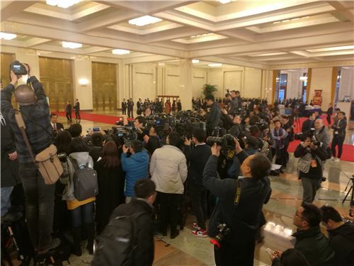 上午9时,十二届全国人民代表大会第五次会议正式开始。媒体工作者摩肩接踵,位置十分局促,但没有人抱怨,很多人都是一直站着拍到了最后。